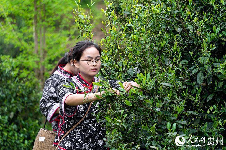贵州省铜仁市沿河土家族自治县塘坝镇榨子村,采茶姑娘正在采摘春茶。人民网记者 涂敏摄